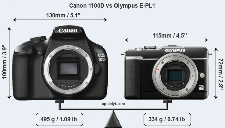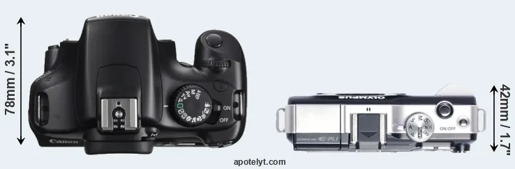 The side-by-side display below illustrates the physical size and weight of the Canon 1100D and the Olympus E-PL1. The two cameras are presented according to their relative size. Three consecutive perspectives from the front, the top, and the back are available. All width, height and depth measures are rounded to the nearest millimeter.