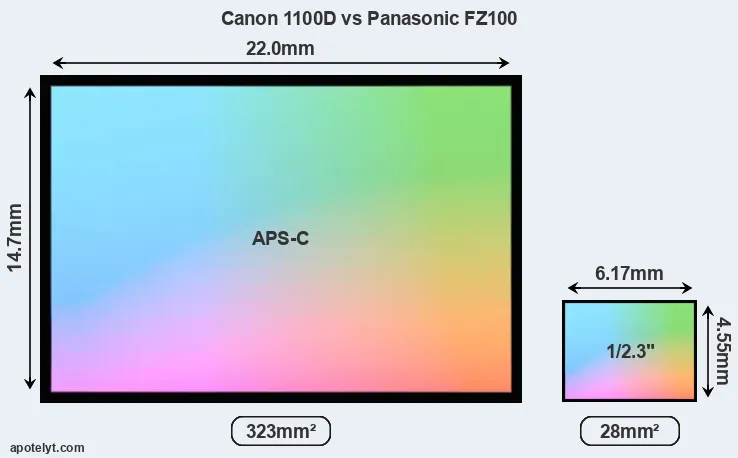 Of the two cameras under consideration, the Canon 1100D features an APS-C sensor and the Panasonic FZ100 a 1/2.3-inch sensor. The sensor area in the FZ100 is 91 percent smaller. As a result of these sensor size differences, the cameras have a format factor of, respectively, 1.6 and 5.6. The sensor in the 1100D has a native 3:2 aspect ratio, while the one in the FZ100 offers a 4:3 aspect.