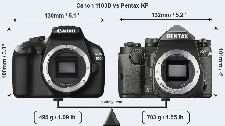 The physical size and weight of the Canon 1100D and the Pentax KP are illustrated in the side-by-side display below. The two cameras are presented according to their relative size. Three consecutive views from the front, the top, and the rear side are shown. All width, height and depth dimensions are rounded to the nearest millimeter.