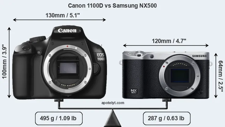 If the front view area (width x height) of the cameras is taken as an aggregate measure of their size, the Samsung NX500 is considerably smaller (41 percent) than the Canon 1100D. Moreover, the NX500 is substantially lighter (42 percent) than the 1100D. In this context, it is worth noting that neither the 1100D nor the NX500 are weather-sealed.