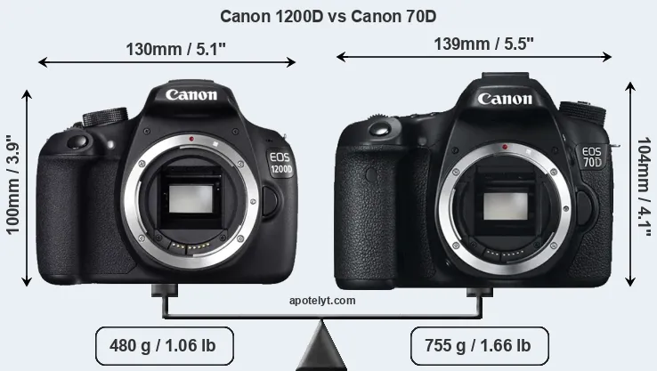 An illustration of the physical size and weight of the Canon 1200D and the Canon 70D is provided in the side-by-side display below. The two cameras are presented according to their relative size. Three successive views from the front, the top, and the rear are shown. All width, height and depth dimensions are rounded to the nearest millimeter.