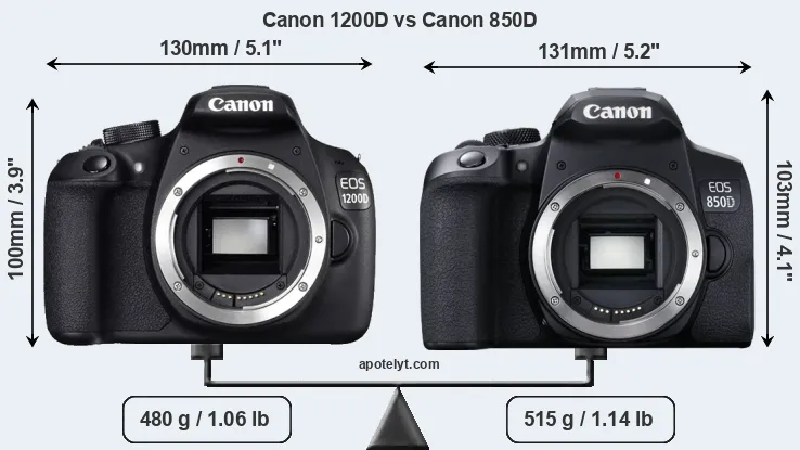 An illustration of the physical size and weight of the Canon 1200D and the Canon 850D is provided in the side-by-side display below. The two cameras are presented according to their relative size. Three consecutive perspectives from the front, the top, and the back are available. All width, height and depth dimensions are rounded to the nearest millimeter.