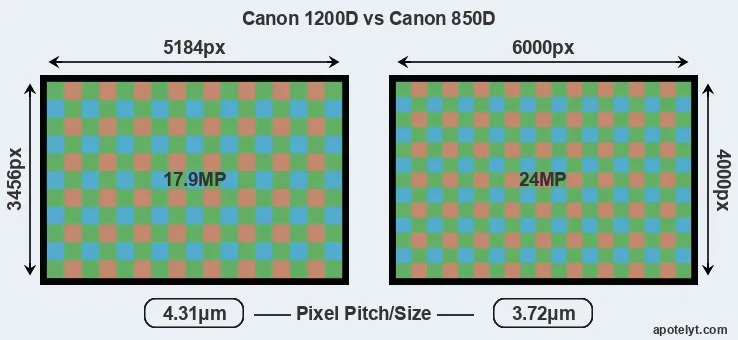 While the two cameras under review share the same sensor size, the 850D offers a higher resolution of 24 megapixels, compared with 17.9 MP of the 1200D. This megapixels advantage translates into a 16 percent gain in linear resolution. On the other hand, these sensor specs imply that the 850D has a higher pixel density and a smaller size of the individual pixel (with a pixel pitch of 3.72μm versus 4.31μm for the 1200D). However, it should be noted that the 850D is much more recent (by 6 years) than the 1200D, and its sensor will have benefitted from technological advances during this time that compensate for the smaller pixel size.
