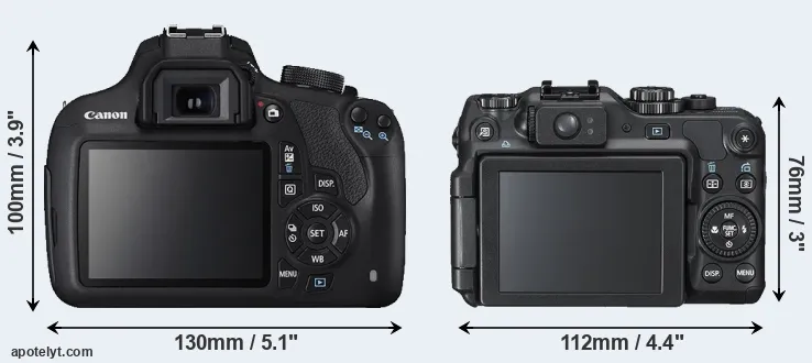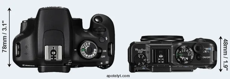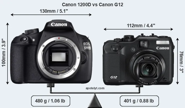 The physical size and weight of the Canon 1200D and the Canon G12 are illustrated in the side-by-side display below. The two cameras are presented according to their relative size. Three consecutive perspectives from the front, the top, and the back are available. All width, height and depth measures are rounded to the nearest millimeter.