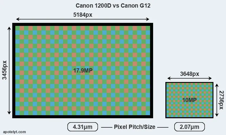With 17.9MP, the 1200D offers a higher resolution than the G12 (10MP), but the 1200D nevertheless has larger individual pixels (pixel pitch of 4.31μm versus 2.07μm for the G12) due to its larger sensor. Moreover, the 1200D is a much more recent model (by 3 years and 4 months) than the G12, and its sensor will have benefitted from technological advances during this time that further enhance the light gathering capacity of its pixels.