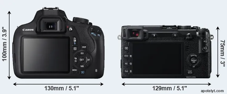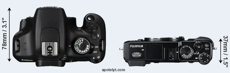 The side-by-side display below illustrates the physical size and weight of the Canon 1200D and the Fujifilm X-E2. The two cameras are presented according to their relative size. Three successive views from the front, the top, and the rear are shown. All width, height and depth dimensions are rounded to the nearest millimeter.