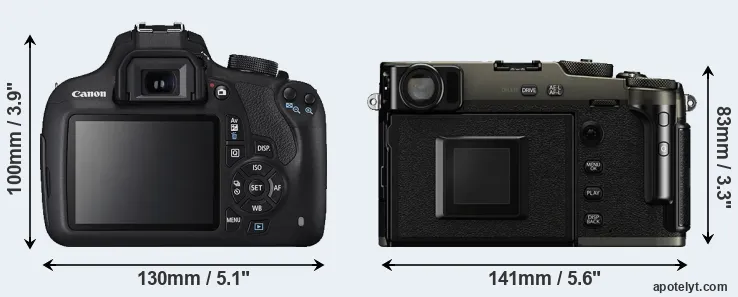 The side-by-side display below illustrates the physical size and weight of the Canon 1200D and the Fujifilm X-Pro3. The two cameras are presented according to their relative size. Three successive views from the front, the top, and the rear are shown. All size dimensions are rounded to the nearest millimeter.