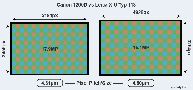 Despite having a smaller sensor, the Canon 1200D offers a higher resolution of 17.9 megapixels, compared with 16.1 MP of the Leica X-U Typ 113. This megapixels advantage comes at the cost of a higher pixel density and a smaller size of the individual pixel (with a pixel pitch of 4.31μm versus 4.80μm for the X-U Typ 113). Moreover, it should be noted that the X-U Typ 113 is a somewhat more recent model (by 1 year and 11 months) than the 1200D, and its sensor might have benefitted from technological advances during this time that further enhance the light gathering capacity of its pixel-units.