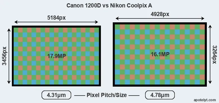 Despite having a smaller sensor, the Canon 1200D offers a higher resolution of 17.9 megapixels, compared with 16.1 MP of the Nikon Coolpix A. This megapixels advantage comes at the cost of a higher pixel density and a smaller size of the individual pixel (with a pixel pitch of 4.31μm versus 4.78μm for the Coolpix A). However, it should be noted that the 1200D is a somewhat more recent model (by 11 months) than the Coolpix A, and its sensor might have benefitted from technological advances during this time that partly offset its pixel-size disadvantage. Coming back to sensor resolution, it should be mentioned that the Coolpix A has no anti-alias filter installed, so that it can capture all the detail its sensor resolves.