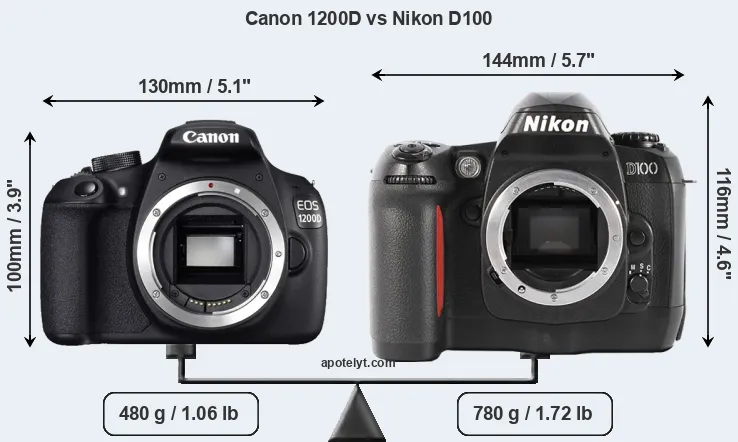 The physical size and weight of the Canon 1200D and the Nikon D100 are illustrated in the side-by-side display below. The two cameras are presented according to their relative size. Three consecutive perspectives from the front, the top, and the back are available. All width, height and depth measures are rounded to the nearest millimeter.