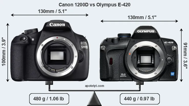The side-by-side display below illustrates the physical size and weight of the Canon 1200D and the Olympus E-420. The two cameras are presented according to their relative size. Three consecutive views from the front, the top, and the rear side are shown. All width, height and depth dimensions are rounded to the nearest millimeter.
