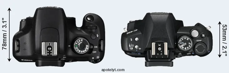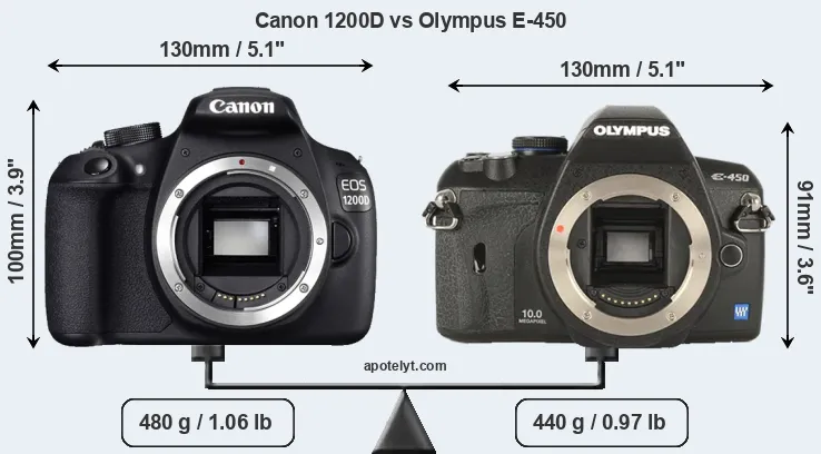 The side-by-side display below illustrates the physical size and weight of the Canon 1200D and the Olympus E-450. The two cameras are presented according to their relative size. Three consecutive views from the front, the top, and the rear side are shown. All width, height and depth dimensions are rounded to the nearest millimeter.