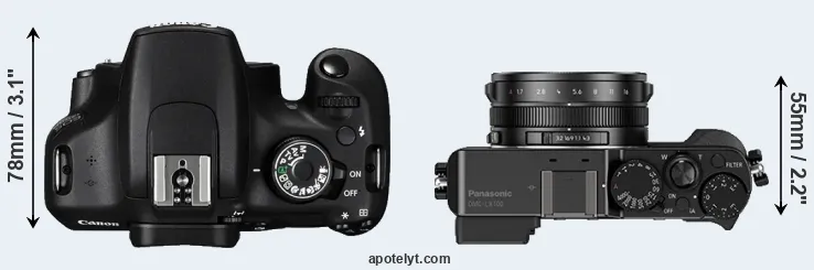 The side-by-side display below illustrates the physical size and weight of the Canon 1200D and the Panasonic LX100. The two cameras are presented according to their relative size. Three consecutive perspectives from the front, the top, and the back are available. All size dimensions are rounded to the nearest millimeter.