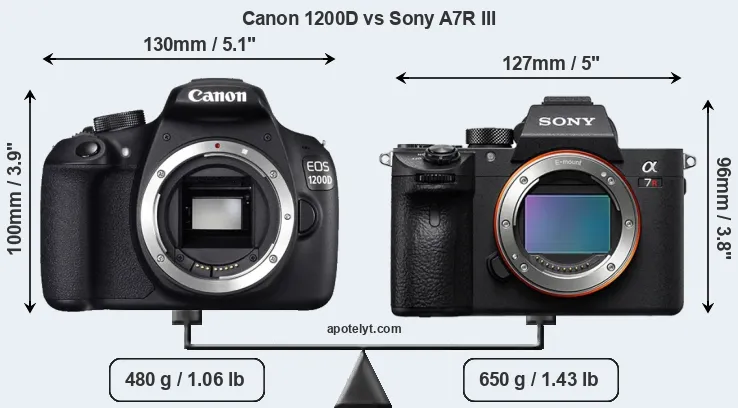 If the front view area (width x height) of the cameras is taken as an aggregate measure of their size, the Sony A7R III is notably smaller (6 percent) than the Canon 1200D. However, the A7R III is substantially heavier (35 percent) than the 1200D. It is noteworthy in this context that the A7R III is splash and dust-proof, while the 1200D does not feature any corresponding weather-sealing.