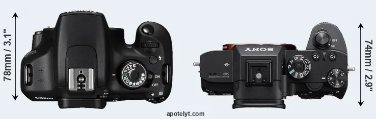An illustration of the physical size and weight of the Canon 1200D and the Sony A7R III is provided in the side-by-side display below. The two cameras are presented according to their relative size. Three consecutive views from the front, the top, and the rear side are shown. All width, height and depth dimensions are rounded to the nearest millimeter.