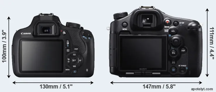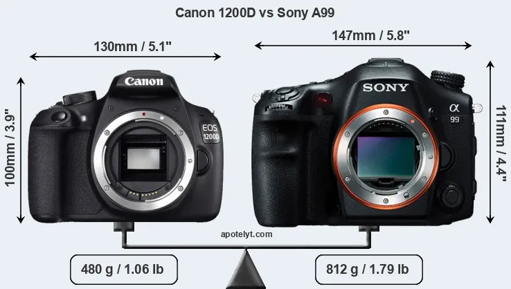 The physical size and weight of the Canon 1200D and the Sony A99 are illustrated in the side-by-side display below. The two cameras are presented according to their relative size. Three successive views from the front, the top, and the rear are shown. All size dimensions are rounded to the nearest millimeter.