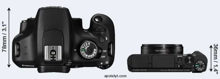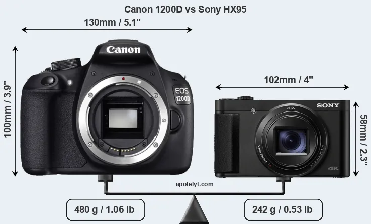The physical size and weight of the Canon 1200D and the Sony HX95 are illustrated in the side-by-side display below. The two cameras are presented according to their relative size. Three successive views from the front, the top, and the rear are shown. All width, height and depth measures are rounded to the nearest millimeter.
