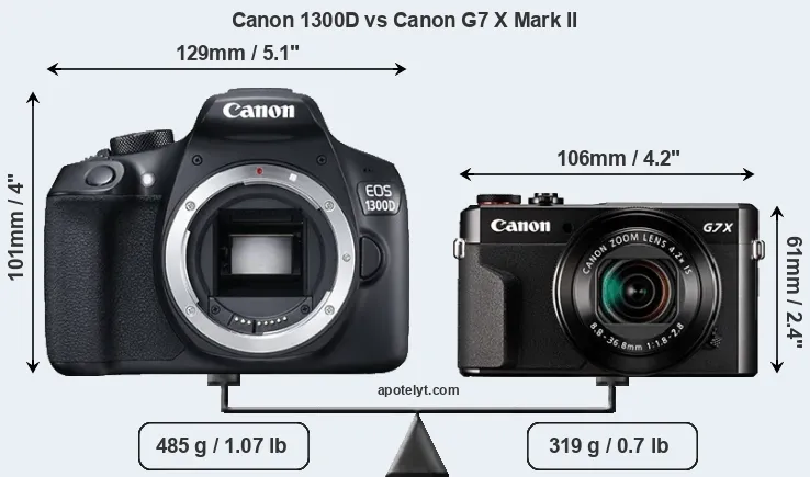 The physical size and weight of the Canon 1300D and the Canon G7 X Mark II are illustrated in the side-by-side display below. The two cameras are presented according to their relative size. Three successive views from the front, the top, and the rear are shown. All width, height and depth measures are rounded to the nearest millimeter.
