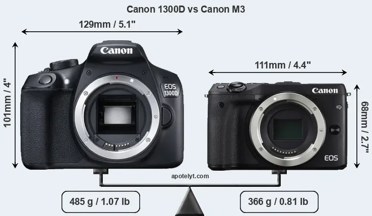 The side-by-side display below illustrates the physical size and weight of the Canon 1300D and the Canon M3. The two cameras are presented according to their relative size. Three consecutive perspectives from the front, the top, and the back are available. All width, height and depth measures are rounded to the nearest millimeter.