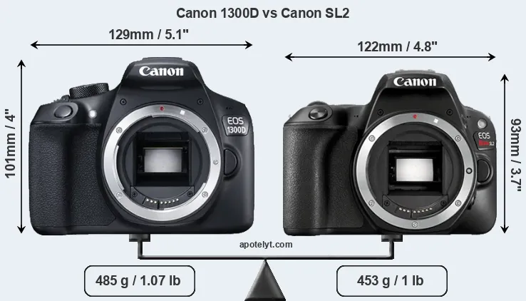 An illustration of the physical size and weight of the Canon 1300D and the Canon SL2 is provided in the side-by-side display below. The two cameras are presented according to their relative size. Three consecutive perspectives from the front, the top, and the back are available. All width, height and depth dimensions are rounded to the nearest millimeter.