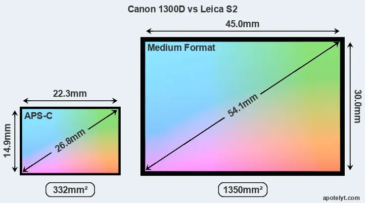 Of the two cameras under consideration, the Canon 1300D features an APS-C sensor and the Leica S2 a medium format sensor. The sensor area in the S2 is 307 percent bigger. As a result of these sensor size differences, the cameras have a format factor of, respectively, 1.6 and 0.8. Both cameras have a native aspect ratio (sensor width to sensor height) of 3:2.