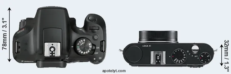 An illustration of the physical size and weight of the Canon 1300D and the Leica X1 is provided in the side-by-side display below. The two cameras are presented according to their relative size. Three consecutive views from the front, the top, and the rear side are shown. All width, height and depth dimensions are rounded to the nearest millimeter.