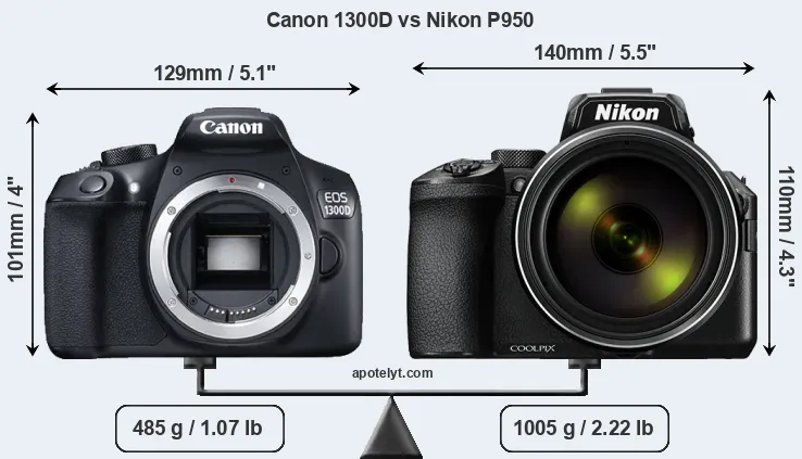 The physical size and weight of the Canon 1300D and the Nikon P950 are illustrated in the side-by-side display below. The two cameras are presented according to their relative size. Three consecutive views from the front, the top, and the rear side are shown. All size dimensions are rounded to the nearest millimeter.