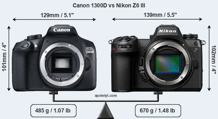 An illustration of the physical size and weight of the Canon 1300D and the Nikon Z6 III is provided in the side-by-side display below. The two cameras are presented according to their relative size. Three consecutive views from the front, the top, and the rear side are shown. All width, height and depth measures are rounded to the nearest millimeter.
