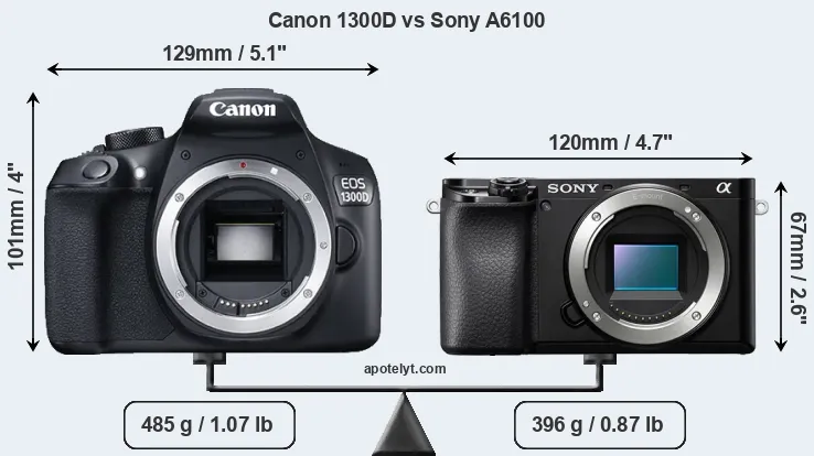 An illustration of the physical size and weight of the Canon 1300D and the Sony A6100 is provided in the side-by-side display below. The two cameras are presented according to their relative size. Three successive views from the front, the top, and the rear are shown. All size dimensions are rounded to the nearest millimeter.