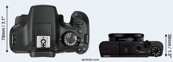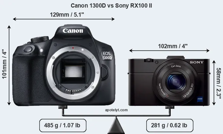 The side-by-side display below illustrates the physical size and weight of the Canon 1300D and the Sony RX100 II. The two cameras are presented according to their relative size. Three consecutive perspectives from the front, the top, and the back are available. All width, height and depth dimensions are rounded to the nearest millimeter.