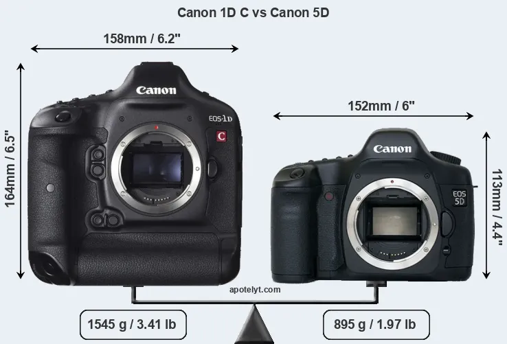 The physical size and weight of the Canon 1D C and the Canon 5D are illustrated in the side-by-side display below. The two cameras are presented according to their relative size. Three consecutive views from the front, the top, and the rear side are shown. All size dimensions are rounded to the nearest millimeter.