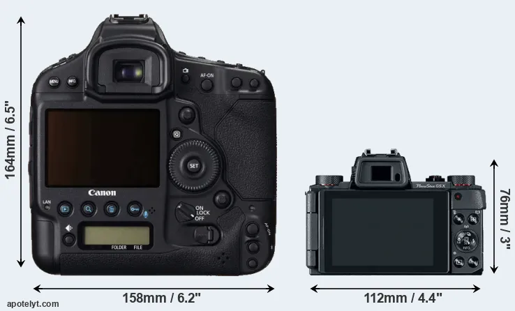 An illustration of the physical size and weight of the Canon 1D C and the Canon G5 X is provided in the side-by-side display below. The two cameras are presented according to their relative size. Three successive views from the front, the top, and the rear are shown. All width, height and depth dimensions are rounded to the nearest millimeter.
