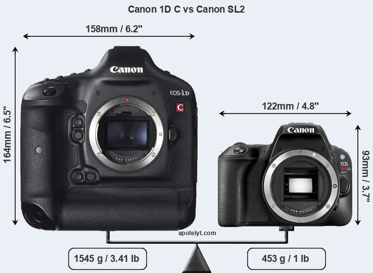 The side-by-side display below illustrates the physical size and weight of the Canon 1D C and the Canon SL2. The two cameras are presented according to their relative size. Three consecutive perspectives from the front, the top, and the back are available. All size dimensions are rounded to the nearest millimeter.
