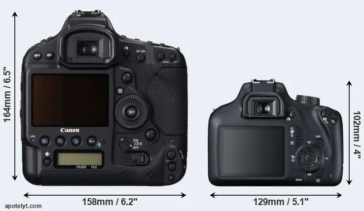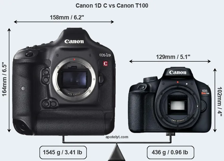 The side-by-side display below illustrates the physical size and weight of the Canon 1D C and the Canon T100. The two cameras are presented according to their relative size. Three consecutive views from the front, the top, and the rear side are shown. All width, height and depth dimensions are rounded to the nearest millimeter.