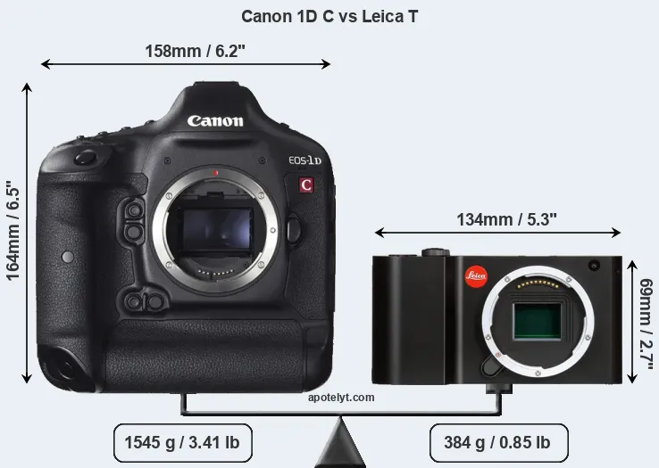 The physical size and weight of the Canon 1D C and the Leica T are illustrated in the side-by-side display below. The two cameras are presented according to their relative size. Three consecutive perspectives from the front, the top, and the back are available. All width, height and depth dimensions are rounded to the nearest millimeter.