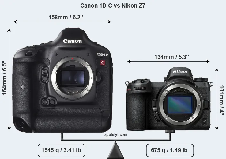 An illustration of the physical size and weight of the Canon 1D C and the Nikon Z7 is provided in the side-by-side display below. The two cameras are presented according to their relative size. Three consecutive perspectives from the front, the top, and the back are available. All width, height and depth dimensions are rounded to the nearest millimeter.