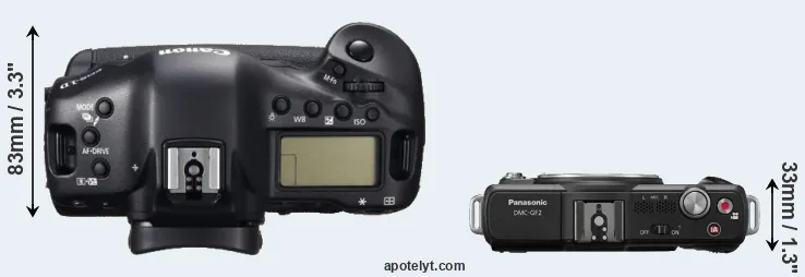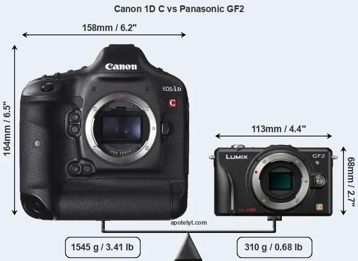 An illustration of the physical size and weight of the Canon 1D C and the Panasonic GF2 is provided in the side-by-side display below. The two cameras are presented according to their relative size. Three consecutive perspectives from the front, the top, and the back are available. All width, height and depth measures are rounded to the nearest millimeter.