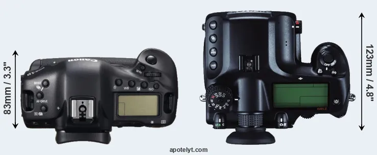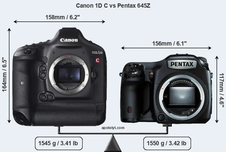 The physical size and weight of the Canon 1D C and the Pentax 645Z are illustrated in the side-by-side display below. The two cameras are presented according to their relative size. Three successive views from the front, the top, and the rear are shown. All width, height and depth dimensions are rounded to the nearest millimeter.