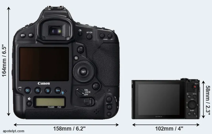 The side-by-side display below illustrates the physical size and weight of the Canon 1D C and the Sony HX80. The two cameras are presented according to their relative size. Three successive views from the front, the top, and the rear are shown. All size dimensions are rounded to the nearest millimeter.