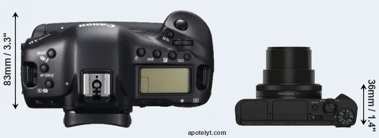The side-by-side display below illustrates the physical size and weight of the Canon 1D C and the Sony HX90V. The two cameras are presented according to their relative size. Three successive views from the front, the top, and the rear are shown. All size dimensions are rounded to the nearest millimeter.
