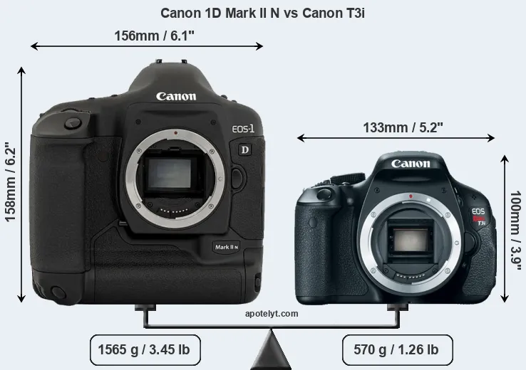 If the front view area (width x height) of the cameras is taken as an aggregate measure of their size, the Canon T3i is considerably smaller (46 percent) than the Canon 1D Mark II N. Moreover, the T3i is substantially lighter (64 percent) than the 1D Mark II N. It is worth mentioning in this context that the 1D Mark II N is splash and dust resistant, while the T3i does not feature any corresponding weather-sealing.