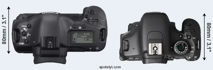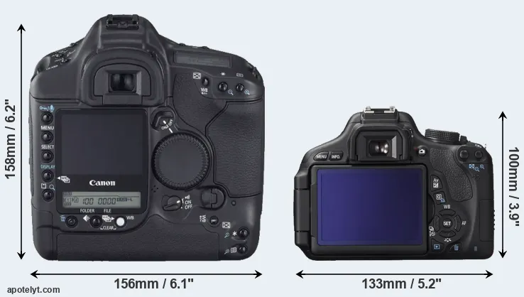 The side-by-side display below illustrates the physical size and weight of the Canon 1D Mark II N and the Canon T3i. The two cameras are presented according to their relative size. Three successive views from the front, the top, and the rear are shown. All size dimensions are rounded to the nearest millimeter.