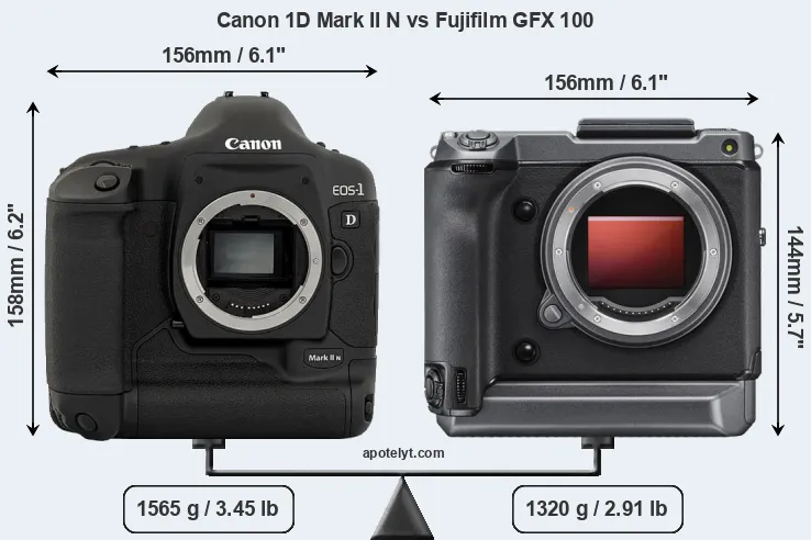 An illustration of the physical size and weight of the Canon 1D Mark II N and the Fujifilm GFX 100 is provided in the side-by-side display below. The two cameras are presented according to their relative size. Three consecutive perspectives from the front, the top, and the back are available. All size dimensions are rounded to the nearest millimeter.