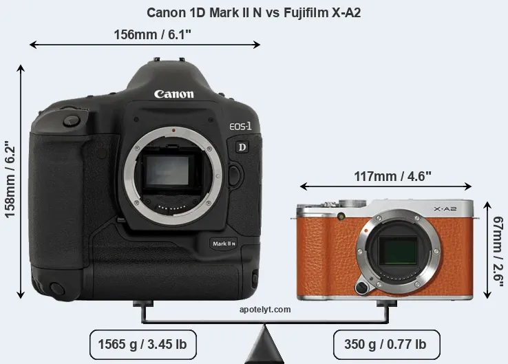 The physical size and weight of the Canon 1D Mark II N and the Fujifilm X-A2 are illustrated in the side-by-side display below. The two cameras are presented according to their relative size. Three consecutive perspectives from the front, the top, and the back are available. All width, height and depth measures are rounded to the nearest millimeter.
