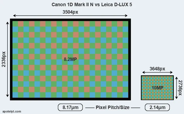 Despite having a smaller sensor, the D-LUX 5 offers a higher resolution of 10 megapixels, compared with 8.2 MP of the 1D Mark II N. This megapixels advantage comes at the cost of a higher pixel density and a smaller size of the individual pixel (with a pixel pitch of 2.14μm versus 8.17μm for the 1D Mark II N). However, it should be noted that the D-LUX 5 is much more recent (by 5 years and 1 month) than the 1D Mark II N, and its sensor will have benefitted from technological advances during this time that make it possible to gather light more efficiently.