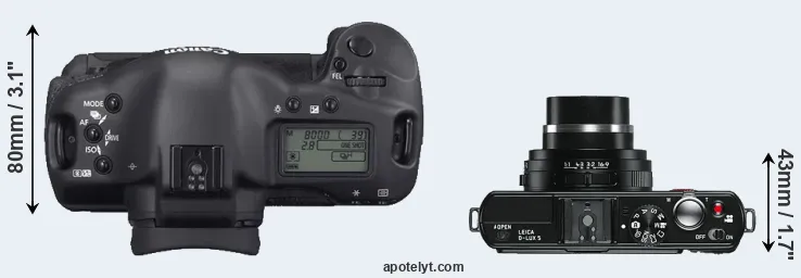 The above size and weight comparisons are to some extent incomplete and possibly misleading, as the D-LUX 5 has a lens built in, whereas the 1D Mark II N is an interchangeable lens camera that requires a separate lens. Attaching the latter will add extra weight and bulk to the setup. You can compare the optics available for the 1D Mark II N and their specifications in the Canon EF Lens Catalog.