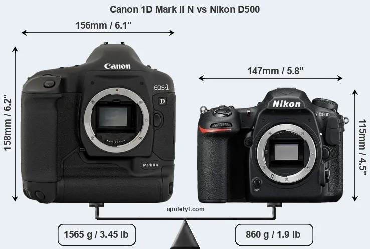 The side-by-side display below illustrates the physical size and weight of the Canon 1D Mark II N and the Nikon D500. The two cameras are presented according to their relative size. Three successive views from the front, the top, and the rear are shown. All size dimensions are rounded to the nearest millimeter.