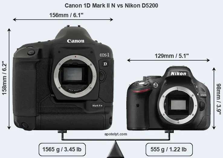 The physical size and weight of the Canon 1D Mark II N and the Nikon D5200 are illustrated in the side-by-side display below. The two cameras are presented according to their relative size. Three consecutive perspectives from the front, the top, and the back are available. All width, height and depth dimensions are rounded to the nearest millimeter.