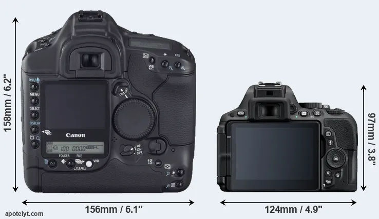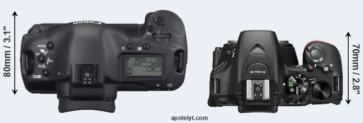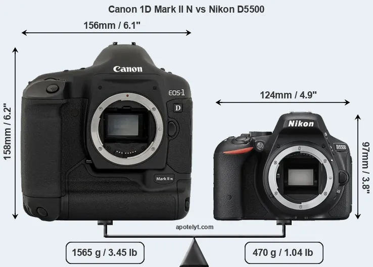 The side-by-side display below illustrates the physical size and weight of the Canon 1D Mark II N and the Nikon D5500. The two cameras are presented according to their relative size. Three consecutive perspectives from the front, the top, and the back are available. All width, height and depth measures are rounded to the nearest millimeter.