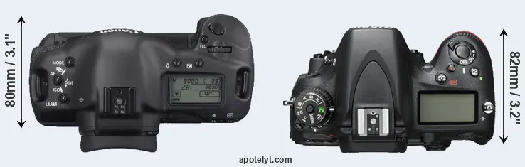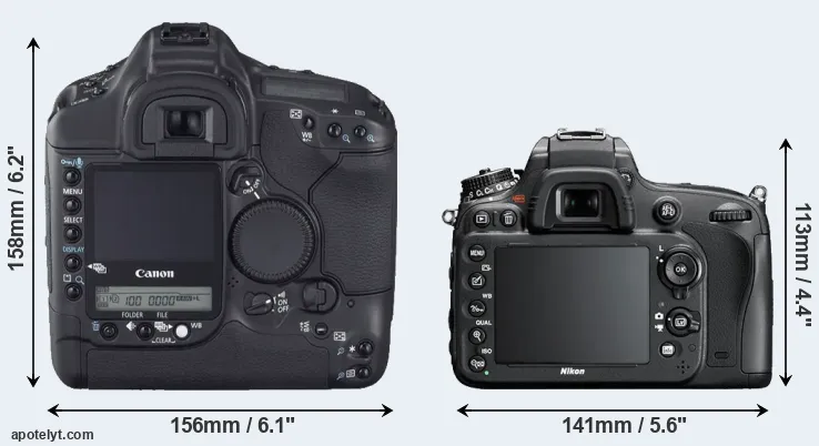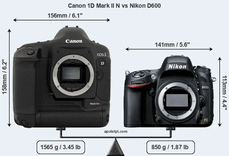 The physical size and weight of the Canon 1D Mark II N and the Nikon D600 are illustrated in the side-by-side display below. The two cameras are presented according to their relative size. Three consecutive perspectives from the front, the top, and the back are available. All width, height and depth dimensions are rounded to the nearest millimeter.